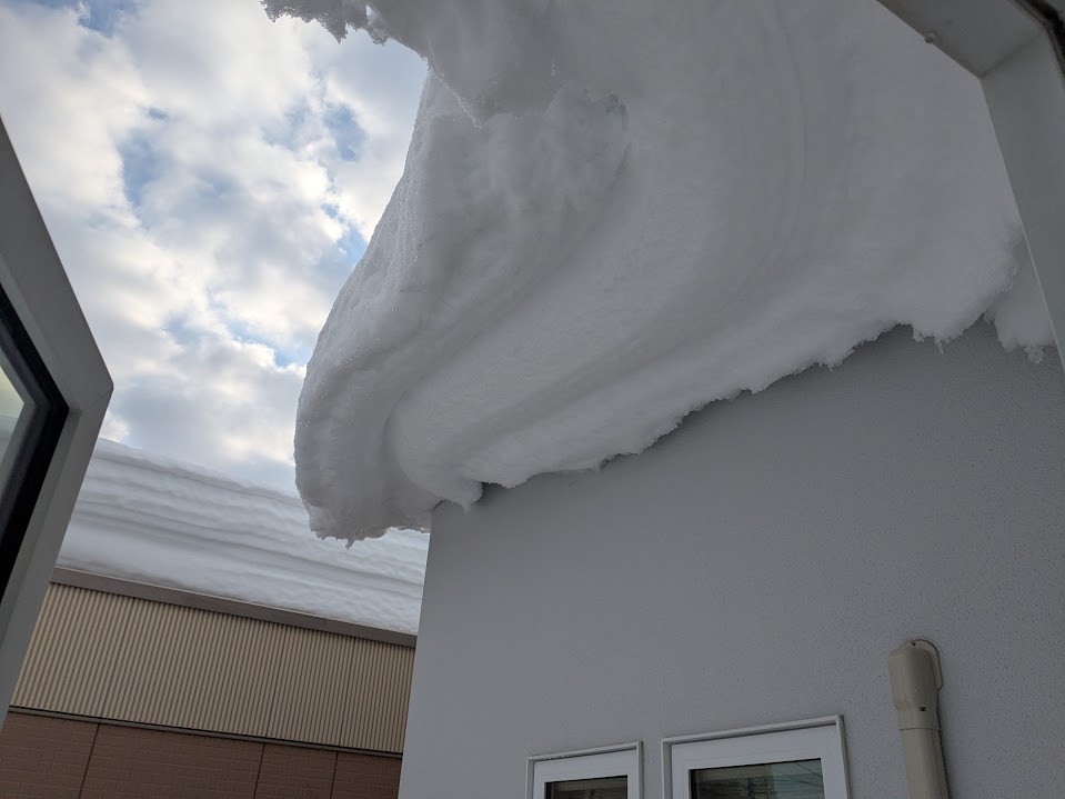 垂れ下がった2階屋根雪の下に設置している室外機を見て「屋根雪が落ちたらこれ、壊れるかも…」と呟いたら、すぐ板を買ってきて対処してくれて「ありがとう」…